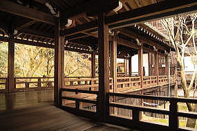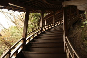 永観堂の七不思議に数えられる臥龍廊。山の斜面に沿って、曲がりながら上に階段が伸びています。