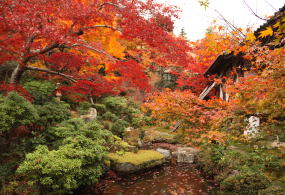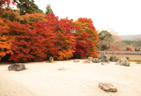 白砂の石組みの枯山水庭園に、迫り来るような紅葉。
