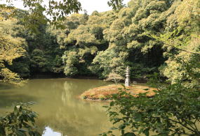 池に浮かぶ島には「白蛇塚」と呼ばれる多宝塔が建ちます。