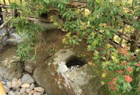 夕佳亭の前にある、足利義政遺愛とされる手水鉢。