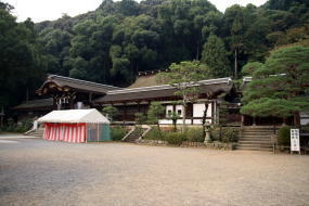 奥に見える本殿は『両流造』(松尾造り)と称される珍しい造りです。